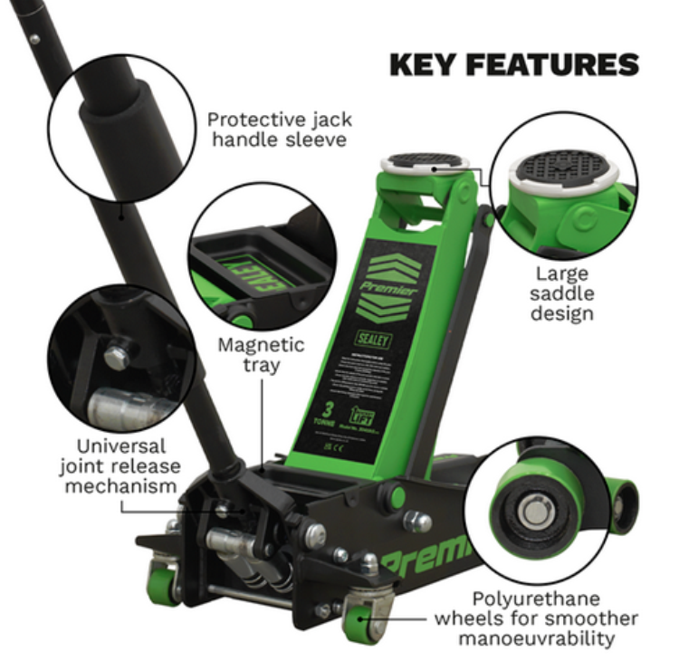 Sealey Low Profile Trolley Jack with Rocket Lift 3 Tonne - Green 3040AG-SEA